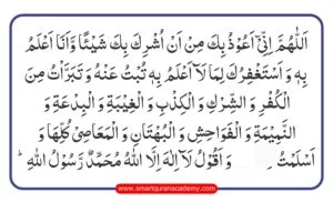 Allah Humma inni Aaoozubika Min An Oshrika Beka Shai Aown Wa Anaa Aalamo Behi Wa Astaghfiroka Lima laa Aalamo Behi Tubtu Anho Wa Tabarrato Minal Kufri Washshirki Wal Kizbi Wal Jheebati Wal Bidaati Wan Nameemati Wal Fawahishi Wal Bohtani Wal Maasi Kulliha Wa Aslamtoo Wa Aamantoo Wa Aqoolo Laa ilaaha illal Lahoo Mohammadur Rasool Ullah.